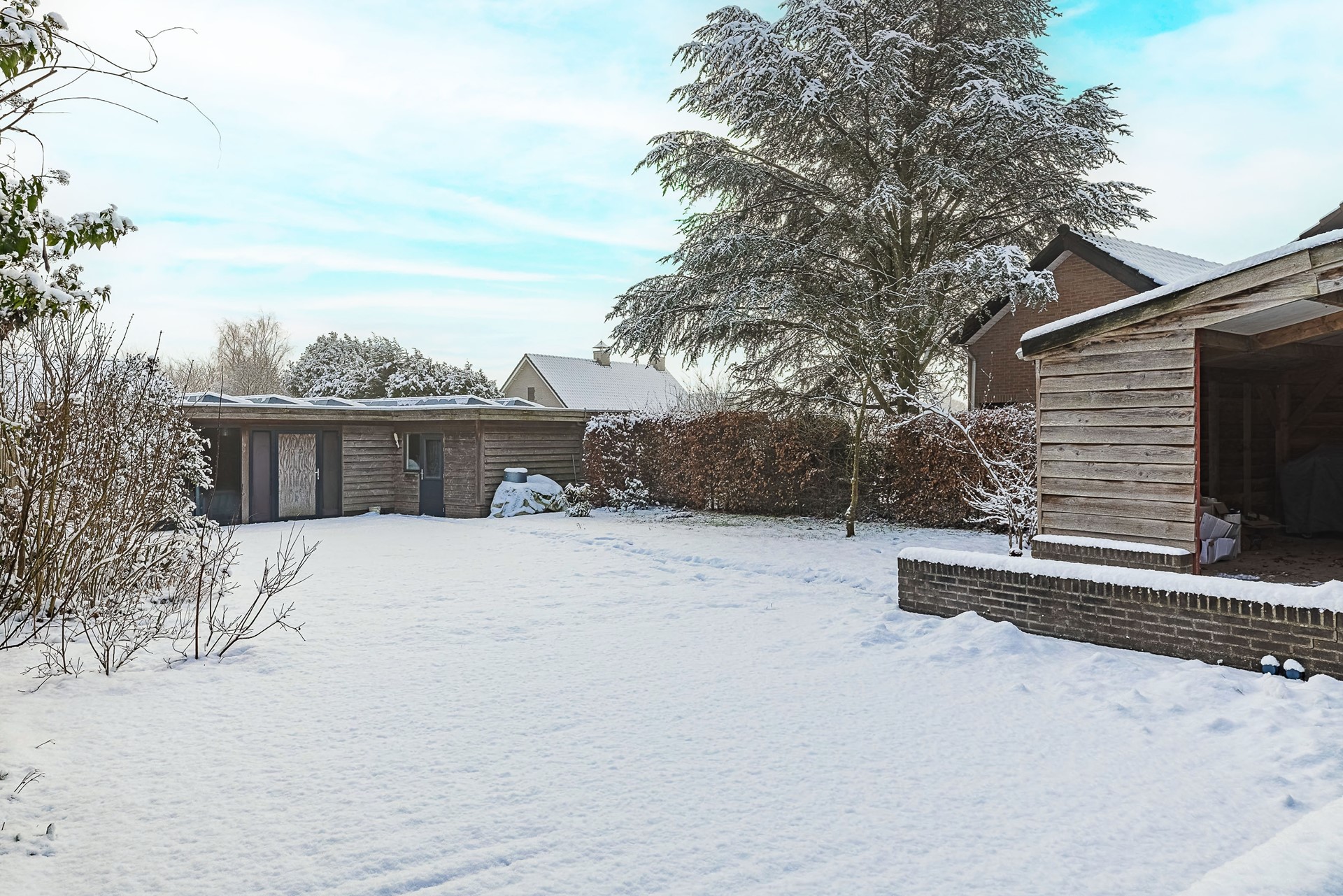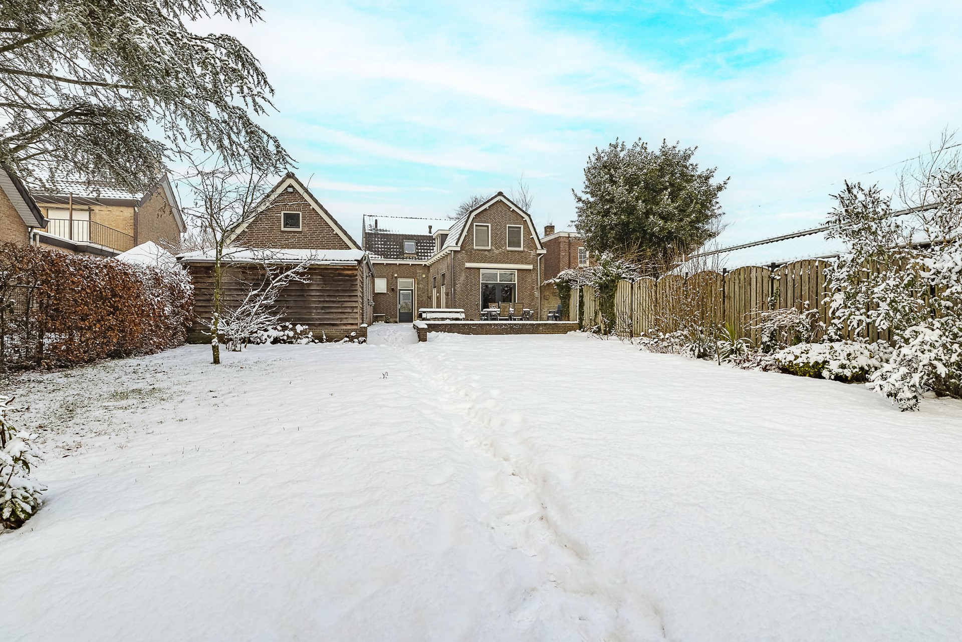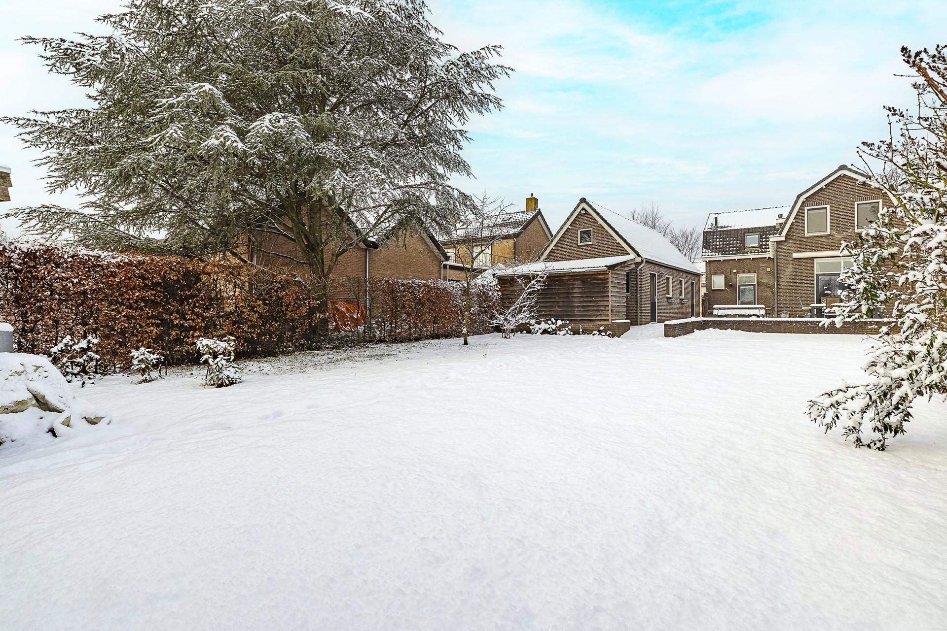 Op een royaal perceel van liefst 654 m² vind je rust, ruimte en een ongekende mate van privacy. De woning ligt weliswaar aan een doorgaande weg, maar dankzij het strategisch geplaatste groen en een slimme indeling beleef je hier vooral rust. Achter het huis strekt een indrukwekkend diepe tuin zich uit. Bovendien kun je via de Oude Baan óók achterom het perceel betreden.